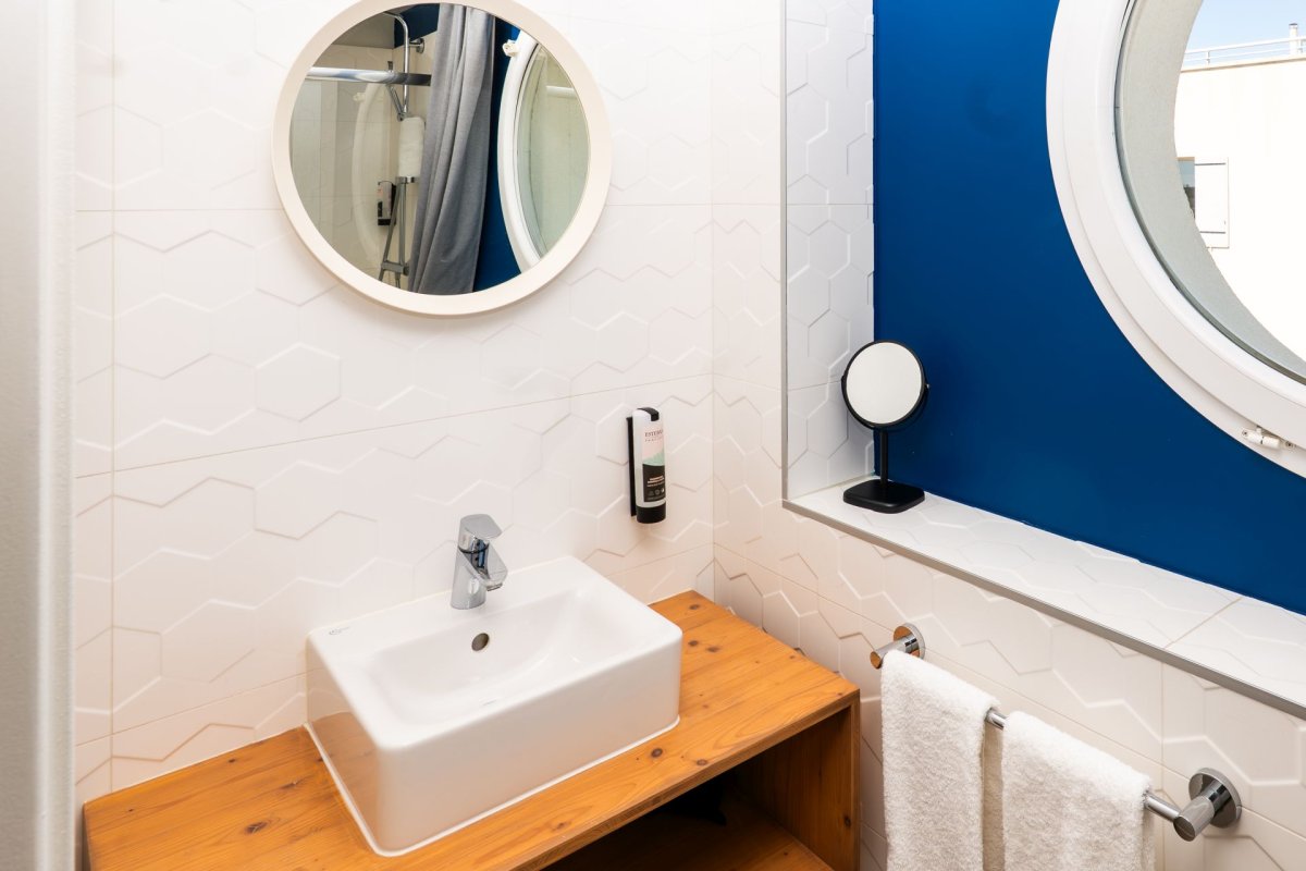 Bathroom equipped with a shower, towel dryer and hair dryer, toiletries.